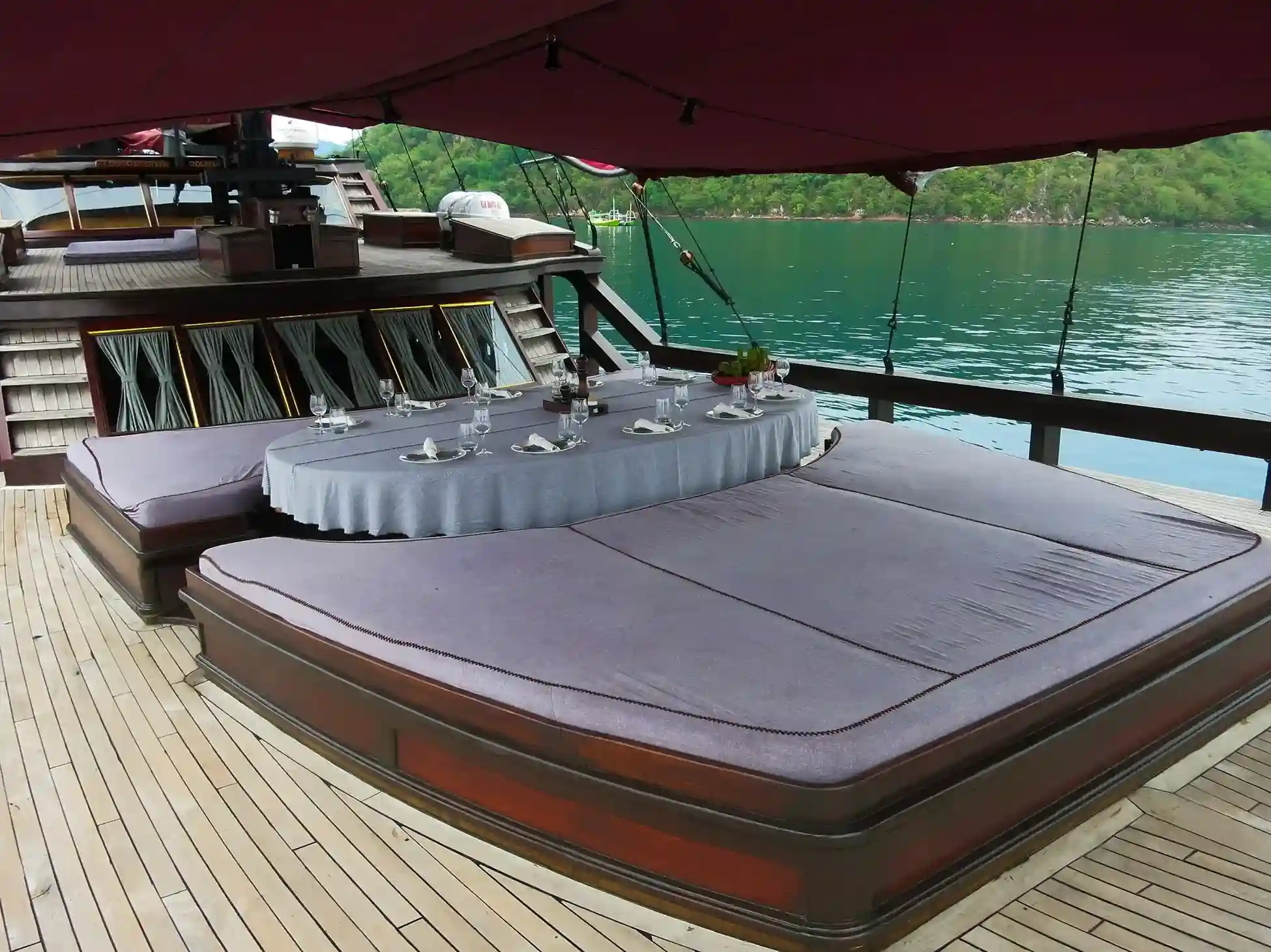 أبحر في المناظر الطبيعية الخلابة في إندونيسيا بسرعة إبحار ثابتة تبلغ 8 عقدة. سواءً كنت منجذباً إلى المناظر الطبيعية البكر أو المواقع التاريخية الرائعة أو المغامرات المثيرة، فإن مانتا ماي يحول أحلامك في الإجازة إلى حقيقة. يمكنك الاسترخاء على السطح الرئيسي الفسيح مع مناظر خلابة أو أخذ حمام شمسي أو الاستمتاع بتناول الطعام في الهواء الطلق أو الاسترخاء في صالون الصالة الفسيح. توفر لك الصالة ملاذاً مريحاً ومكيّفاً ومزوداً بتلفزيون LED مقاس 60 بوصة وجهاز ستيريو هاي فاي ومكتبة ومركز كمبيوتر وبار مريح لتناول القهوة والشاي.