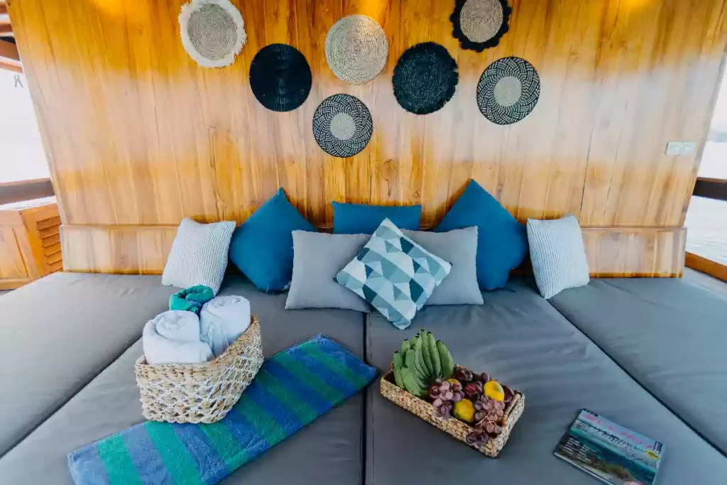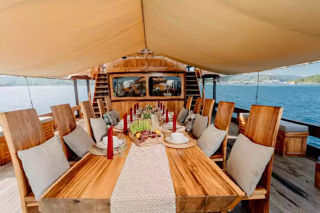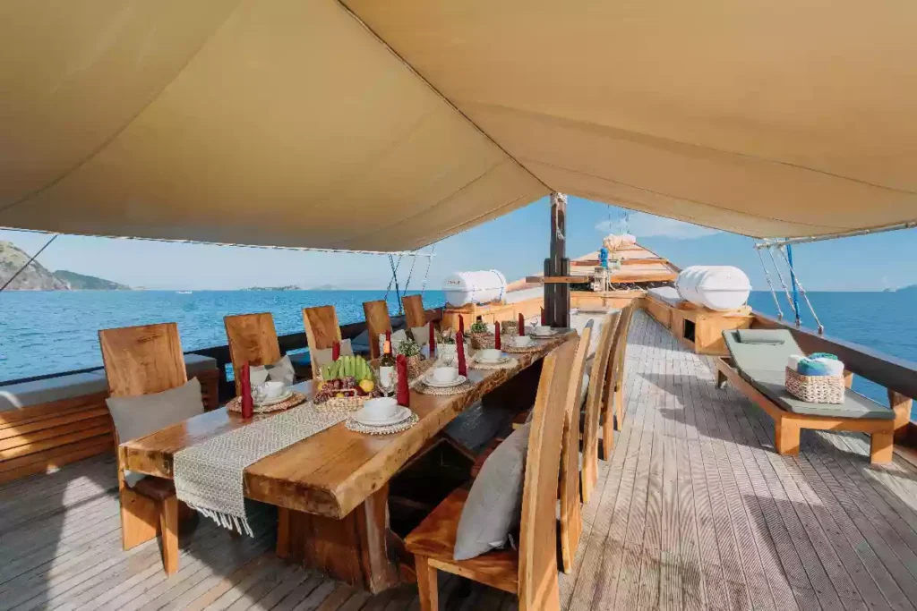 The Andamari Phinisi is a luxurious boat charter designed for up to 12 guests, offering a spacious and comfortable experience with 6 beautifully appointed cabins. Built from a combination of durable ironwood and teak, the boat spans 30 meters in length and 7.95 meters in width, providing a stable and elegant cruising experience through Komodo National Park. Powered by a 6D40 double turbo engine, the Andamari Phinisi cruises at a speed of 8 knots, ensuring smooth travel across the stunning waters of Komodo. Equipped with advanced Garmin GPS, marine radio, and VHF radio, this boat guarantees both safety and reliability, Andamari Phinisi Boat Charter is perfect choice for your Komodo tour adventure.