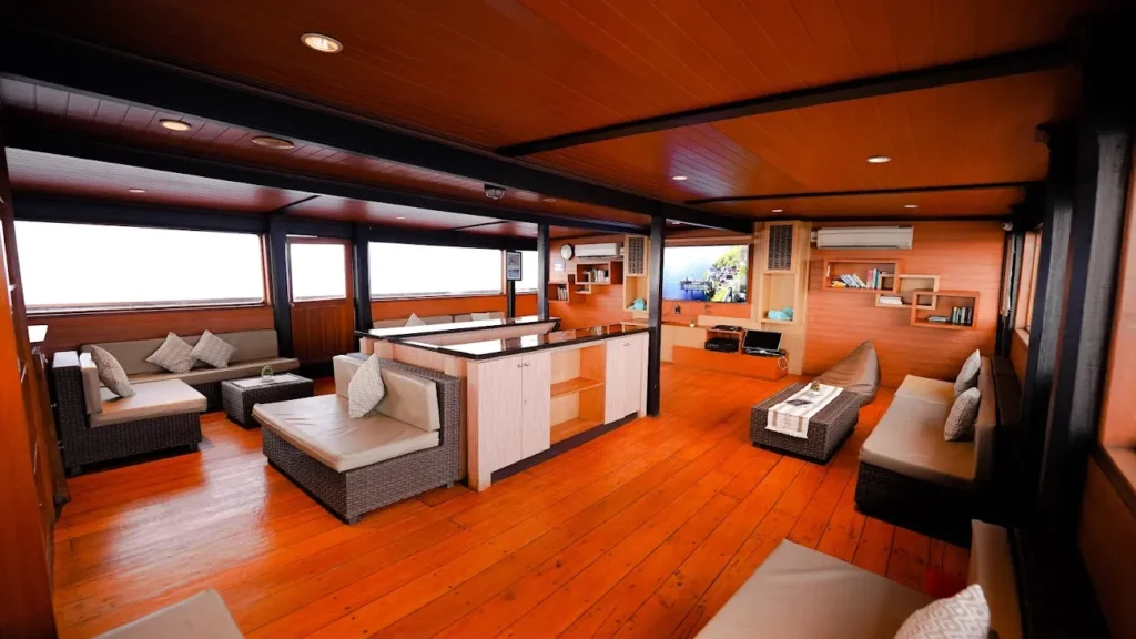 Designed with the discerning adventurer in mind, Sea Safari 8 is equipped with an array of facilities that ensure a comfortable and enriching experience. The liveaboard features 12 air-conditioned cabins with ensuite bathrooms, accommodating up to 26 guests in comfort and style. The indoor amenities include a cozy restaurant that offers panoramic views of the ocean and a well-stocked bar, perfect for socializing or relaxing after a day of diving. Outdoor enthusiasts will appreciate the spacious sun deck and a dive deck that provides easy access to the ocean’s wonders. Additional facilities enhancing the liveaboard experience include a camera station for photography enthusiasts, a jacuzzi for relaxation, and an array of water sports equipment like snorkeling gear and kayaks. The Sea Safari 8 ensures that every moment aboard is memorable, whether you’re lounging, dining, or diving in the beautiful waters of Raja Ampat.
