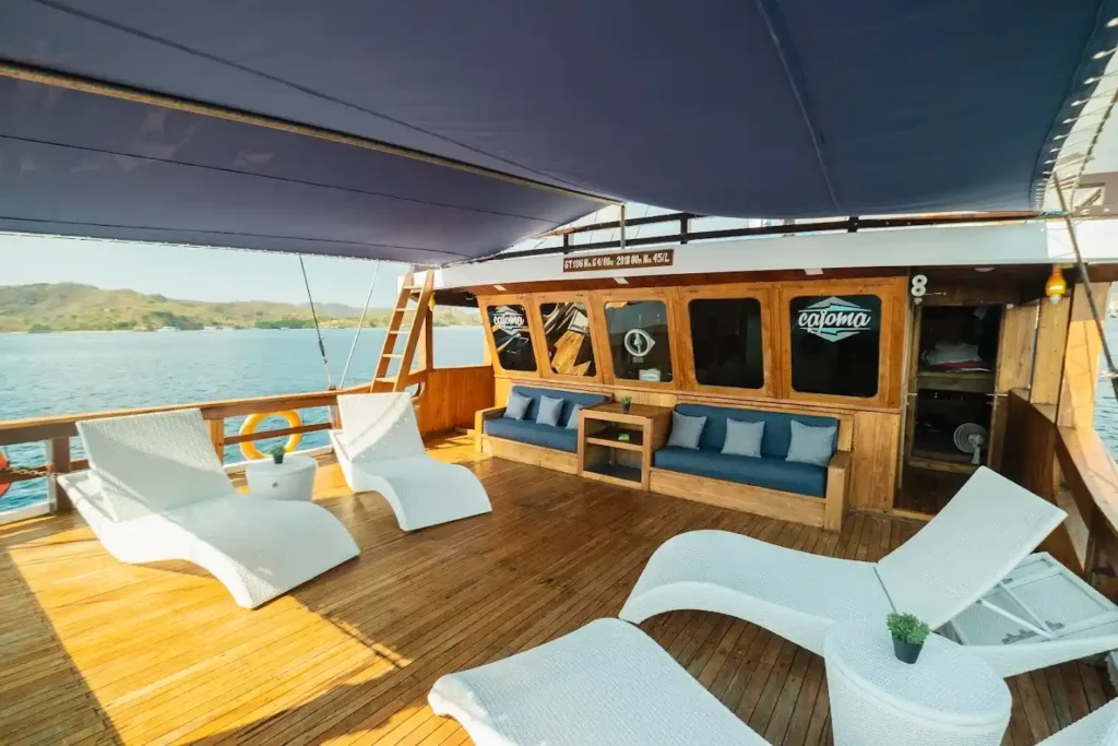 Safety and reliability are top priorities, supported by modern navigation tools like GPS and radar, along with comprehensive safety equipment including life rafts, extinguishers, and oxygen kits. With its perfect mix of comfort, craftsmanship, and thoughtful amenities, Cajoma V Phinisi truly sets the standard for a boat charter experience in Komodo.