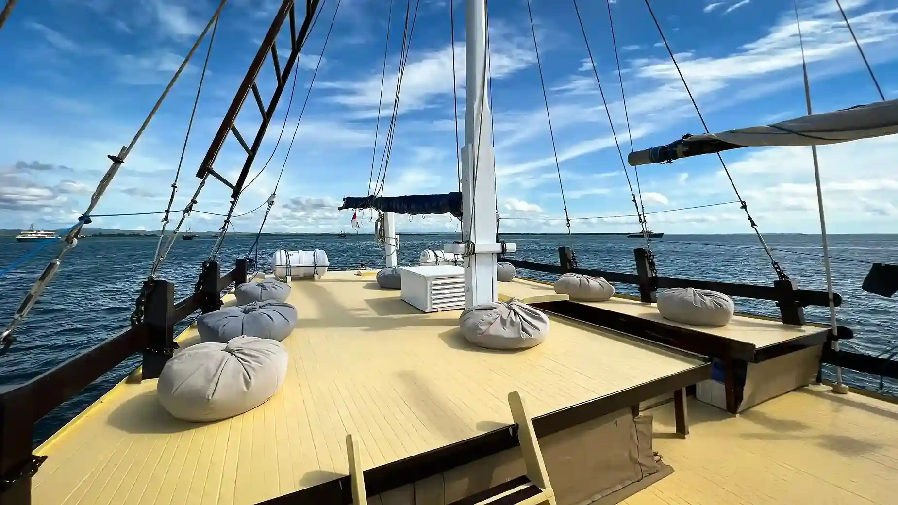 Teman Liveaboard is a 36-meter traditional Indonesian phinisi with a 28-meter deck and 7.5-meter beam, designed to take you deep into Raja Ampat's most spectacular dive sites. Powered by Mitsubishi 6D22 engines 270hp, this Teman Liveaboard Boat Charter cruises comfortably at 7 knots with a maximum speed of 9 knots, while the classic two-mast, six-sail setup gives you that authentic phinisi experience. Technical capabilities include dual Bauer air compressors, an NRC Nitrox membrane system (500L), a water maker, 2x 3,500L freshwater capacity, and 2x3,500L fuel reserves that allow extended trips to remote Raja Ampat locations. The 220V/50Hz electrical system runs on 40KVA and 22.5KVA gensets, ensuring reliable power throughout your journey. With a 2.4-meter draft, Teman can navigate both deep channels and shallower reef areas, giving you access to dive sites that larger boats simply can't reach.