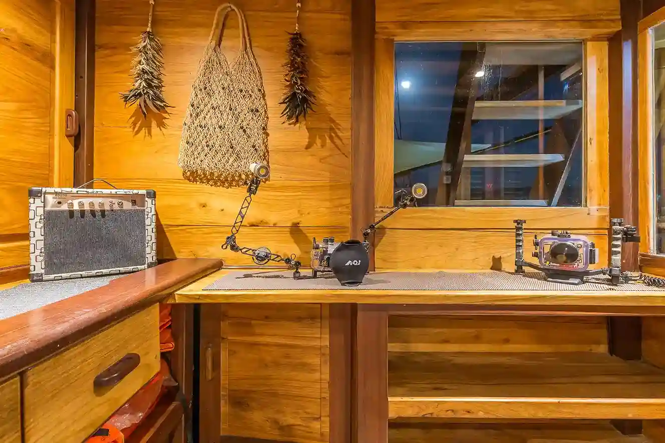Teman Liveaboard Boat Charter features five air-conditioned cabins with ensuite bathrooms—Master Cabin Sulawesi, double cabins Banda and Flores, and triple cabins Celebes and Seram. The fully-equipped dive deck is Nitrox-ready with dual Bauer compressors and gear rental available for those traveling light. The indoor dining area serves fresh buffet-style meals blending Indonesian and Western home cooking, while the indoor lounge offers bean bags, pillows, TV, karaoke, comfortable sofa seating, and a library for quiet moments between dives. Head up to the sun deck where you’ll find more bean bags, shaded areas, coffee tables, and ambient lounge lighting—the perfect spot for enjoying Raja Ampat’s stunning sunsets or stargazing after a day of incredible diving.